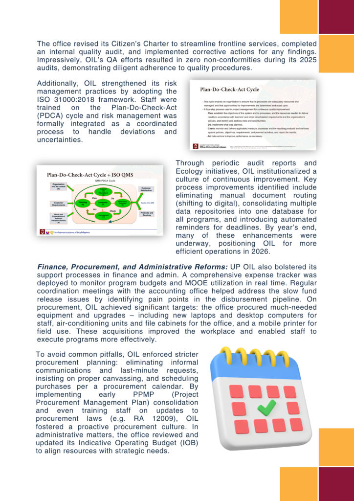 Major initiatives such as UP HIRAYA, UP VINTA, GALINANGAN Good Governance Training Program, and SURI advanced OIL’s objectives, alongside robust efforts in organizational development, digital transformation, and quality assurance.